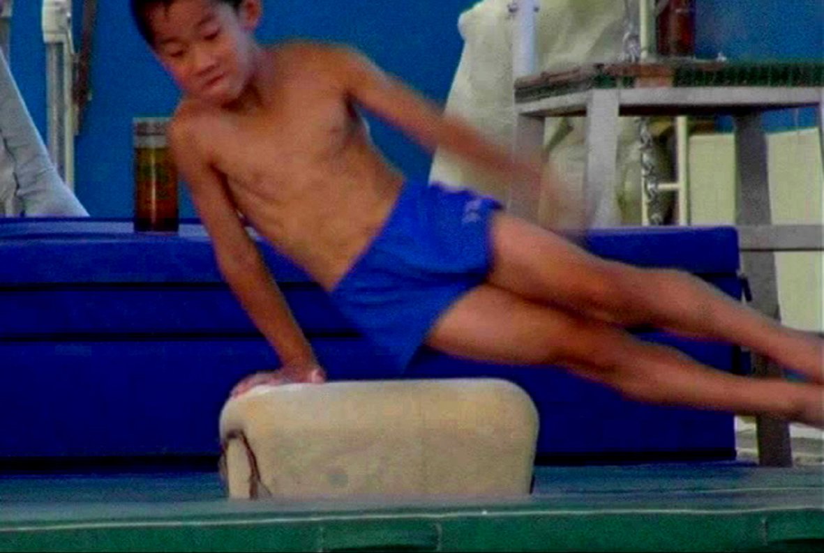 Ein junger Leistungssportler führt in höchster Konzentration Kreisflanken auf einem Bock aus. Die knapp vierzehnsekündige Sequenz hat de la Garenne zu einem nahtlosen Loop montiert, der das Kind zu einer endlosen Wiederholung der kräftezehrenden Übung verdammt. Das dumpfe, rhythmische Klopfen des belasteten Handwechsels wirkt wie der hastige Schlag eines überforderten Herzens.